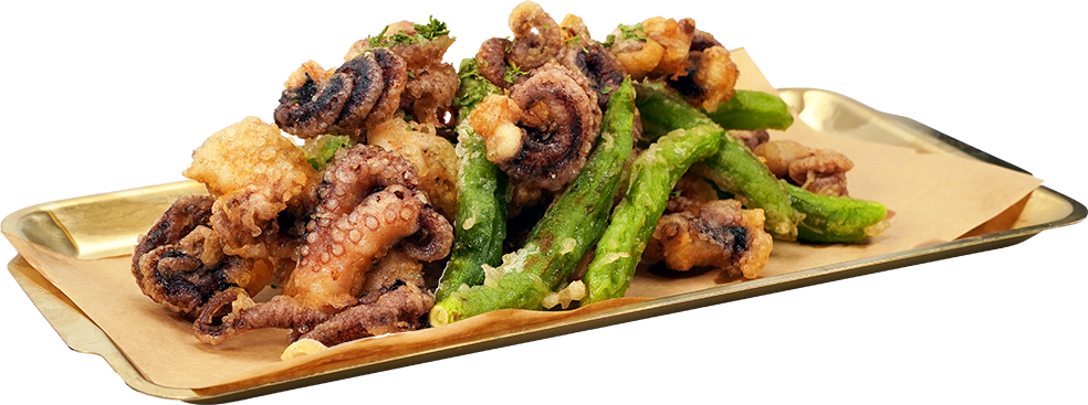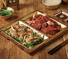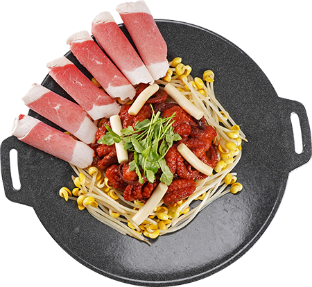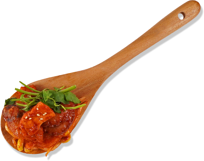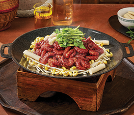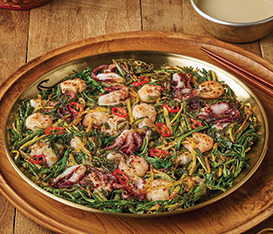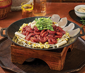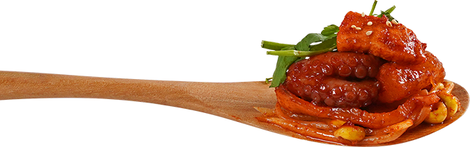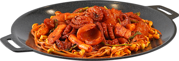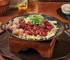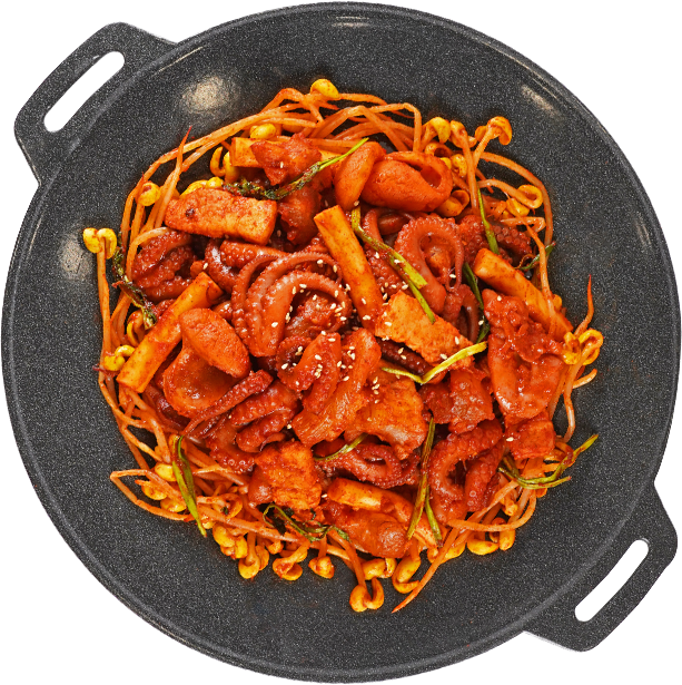 매콤달콤한 숙성 양념을 흠뻑입은 쭈꾸미 철판 콩나물과 향긋한 미나리가 더해져 깔끔한 맛